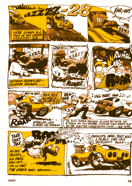 This is one of 2 cartoons that Mr. Deal created for the Revell Modeler's Club newsletter. The file is quite large and might take a while to load, but when I tried to reduce it, it was impossible to read the text, and you must read it to appreciate it. This obviously depicts the young Zzzzz-28 driver up to his neighborhood-destroying antics! This cartoon would have helped launch the reissue of the Deal's Wheels models through the Revell Modeler's Club.