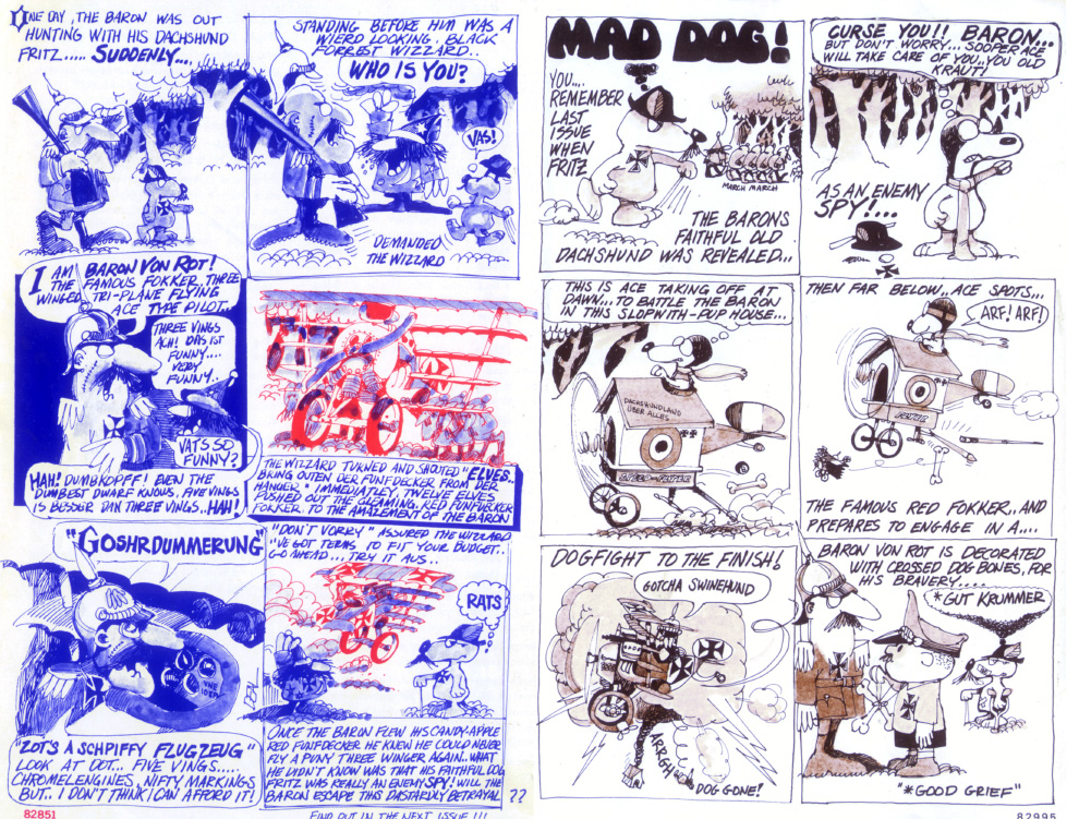Part 1 depicts the Baron Von Rot meeting his glorious Funfdecker Fokker for the 1st time. Love at 1st sight!! What about his dachsund Fritz, could this be a clever ploy to foil the Baron?