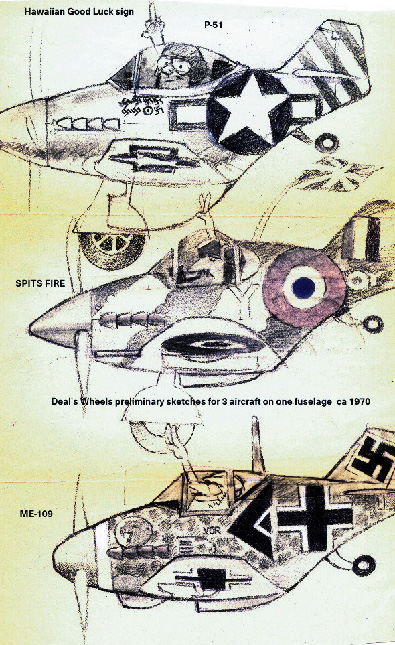 Aaah, what might have been... wouldn't it be great to have that never-built P-51 at the top sitting next to Rif Raf (middle) and Weiner Moldy (bottom) in your display case? Notice the famous 1-2-3 salutes, only Rif Raf's peace sign salute made it into production! Notice the details, the P-51 apparently took out one of Rif Raf's flying companions; also the Big Deal explained to me that the joke behind "VOR" (on Weiner's ME-109) as follows:
