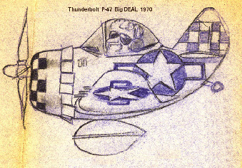 More sketches of what might have been had the Deal's Wheels line continued for a while. Above is a "Marnie" Corsair, if I haven't mentioned elsewhere, the Big Deal was a Marine too, so this would be a fond tribute to those days!! Below is a suave dude with shades on piloting a Thunderbolt. Looks like he's got enough fuel capacity to take him on quite a trip!